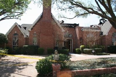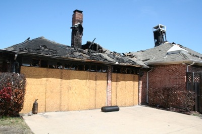 This is a picture taken from the street in front of the house. Most of the roof was completely burned during the fire.