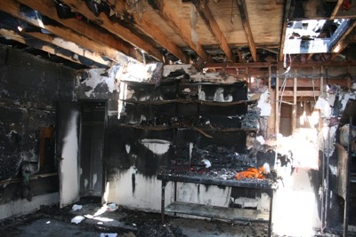 This is a picture taken from the street in front of the house. Most of the roof was completely burned during the fire.